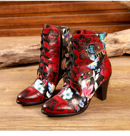 Koznoy 6cm Gold Velvet Print Flower Genuine Leather Boots Woman Autumn Spring Ankle Knee High Chunky Heels Plus Size Zip Shoes - CB057
