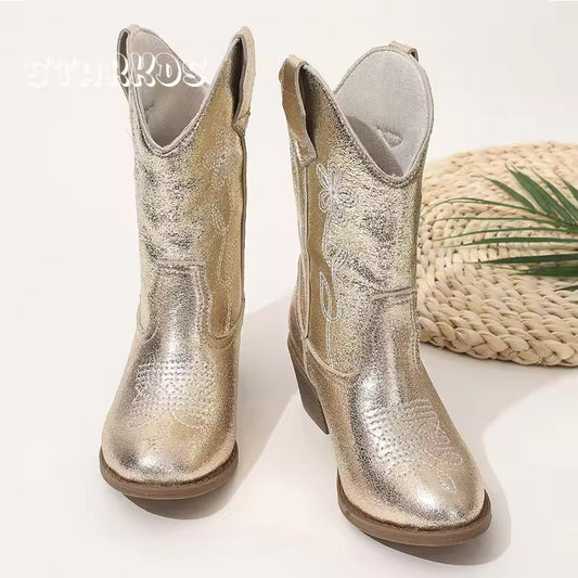 Kids Girls Fashion Metallic Cowboy Boots Mid-Calf Colorful Embroidery Side Zipper Low Heel Party Daily Footwear Multiple Colors - CB077