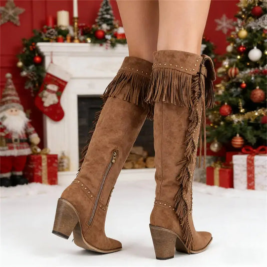 Onlymaker Women Pointed Toe Fringe Rivet Brown Faux Suede Leather Knee High Boots Vintage Side Zipper Fringe Boots - CB046