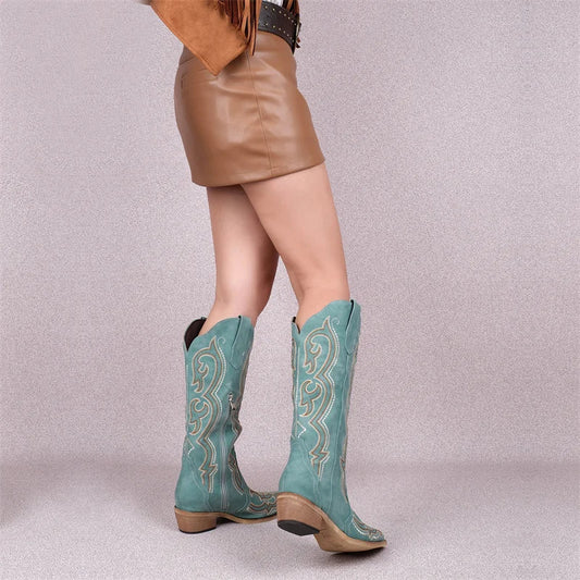 Onlymaker Women Pointed Toe Side Zipper Knee High Embroidery Western Cowgirl Boots Chunky Heel Embroidery Cowboy Boots - CB045