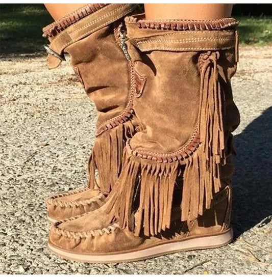 Pirate Boots Woman Pleated Tassel Mid-calf Boots Womens Sewing Footwear Buckle Leather High Heels Shoes Female Plus Size Zip - CB033