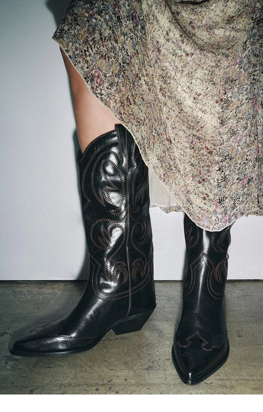 Retro Sle Embroidered Western Cowboy Boots High Tube arp Point Thi Heel Women's Boots Student Suitable All Season - CB052